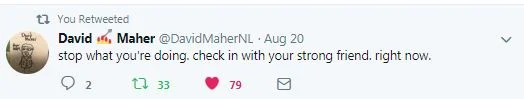 Friends checked in on me. That's another thing people need to learn about more-- to reach out without someone telling you they need help. The posts go up saying that if someone ever needs to talk, they are there. But what needs to happen, just like the tweet posted by David said, is to stop on a random day, and text that person to check in on them. Your strongest friend. Your weakest friend. But it's not your fault if you don't reach out. An open and honest conversation about suicide is a recent thing. We're continuing to learn. It is someone's choice.